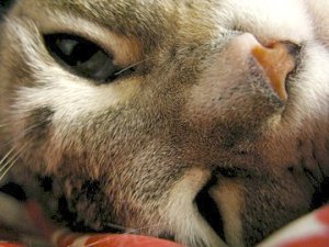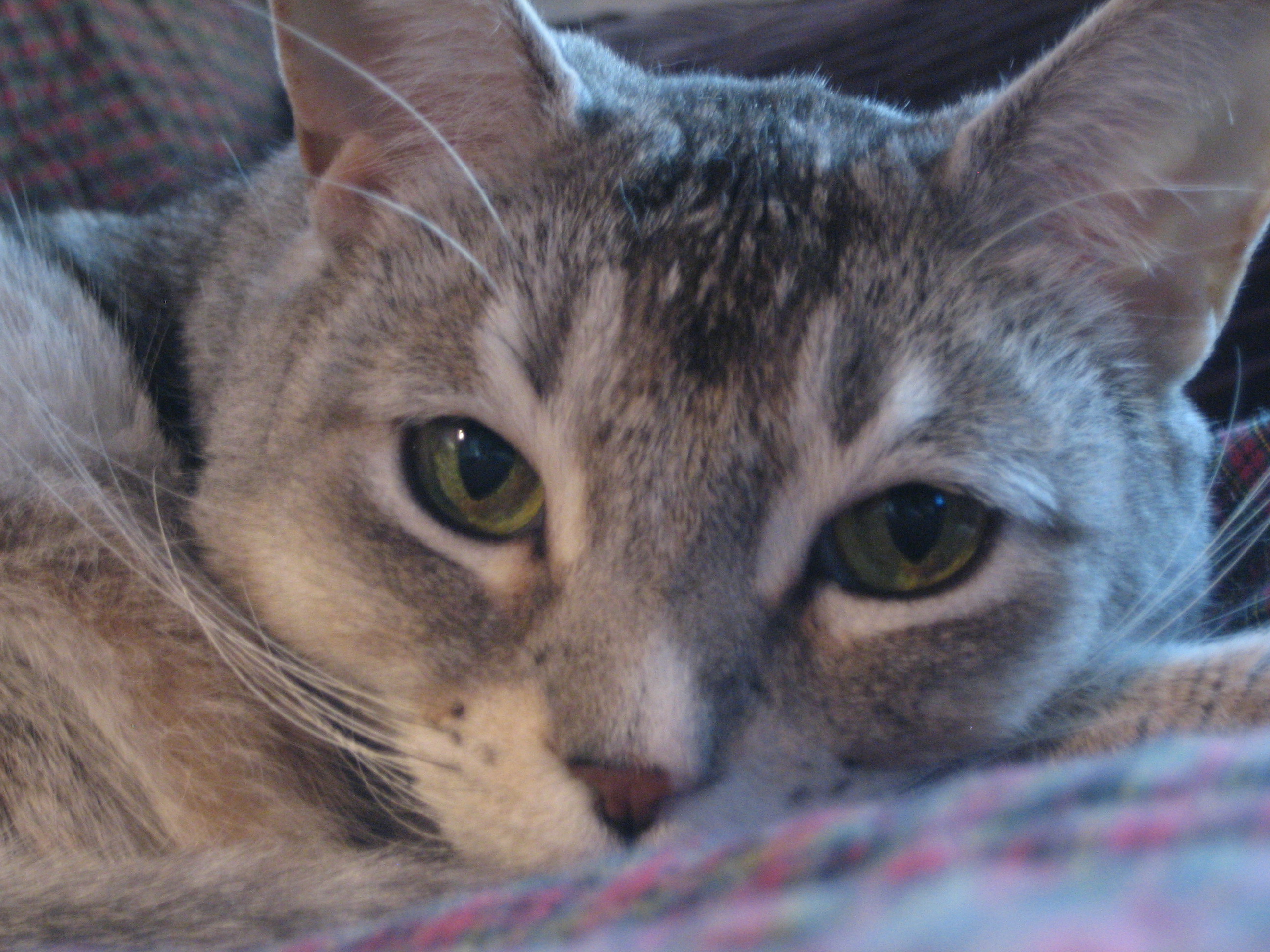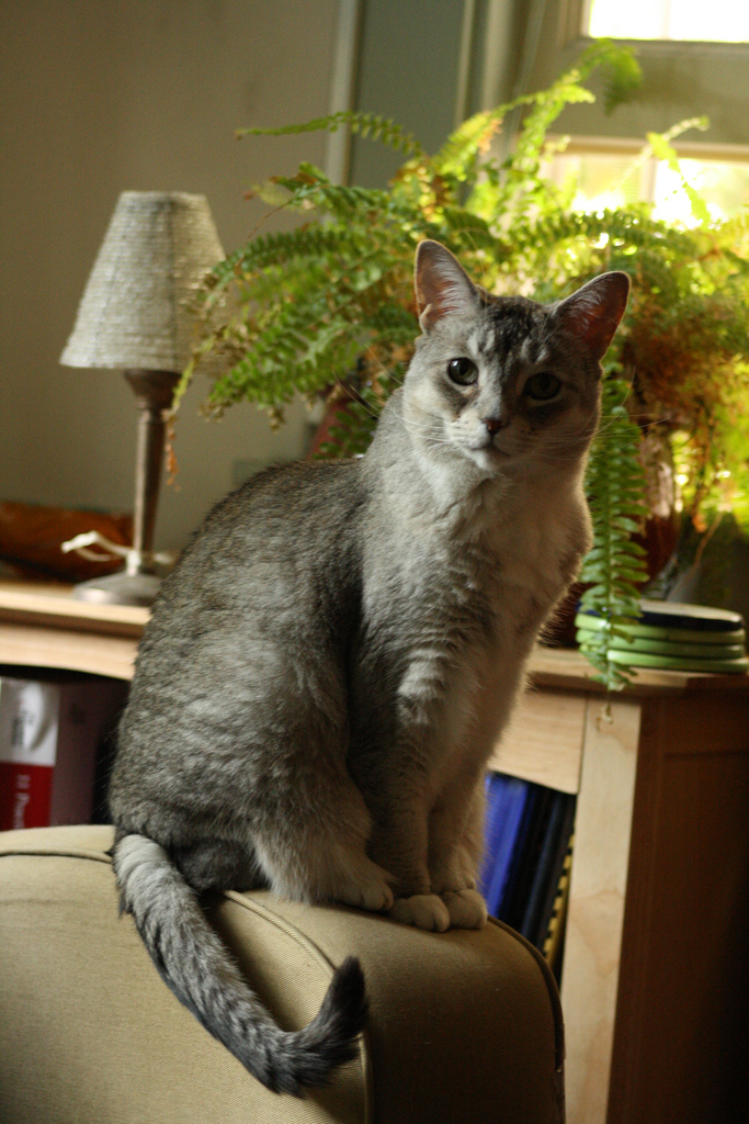 She would holler and meow like crazy when we came home. And I think she recognized the sound of my car; she seemed like she always knew when I was coming in. She sat like a gargoyle protector on the arm of the couch, next to me, while I sat there. She liked to head butt. She loved coming in to the bathroom after I got out of the shower, rubbing around my wet legs. She had a funny white spot on her nose, that extended on to the pebbled texture pink part of her nose. Her whiskers curled up, not down.