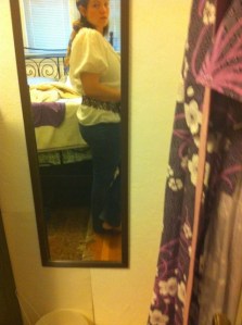 I concocted a plan.  A head scarf!  I covered up all the grimy hair with a fancy scarf.  In fact, the very same scarf that I had around my neck with the Frenchness.  In order to make this seem like a normal thing to wear, I also put on a blousy white shirt with puffy sleeves.  And since the shirt is rather voluminous, I put a big belt on top of it.