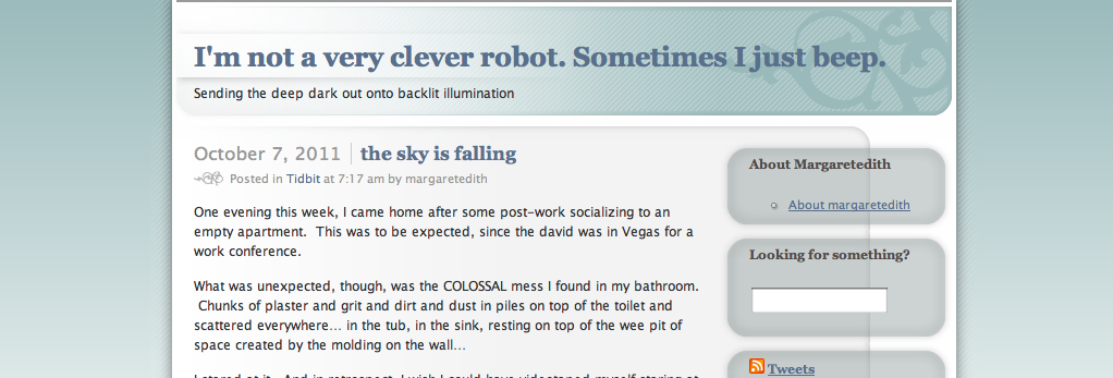 But then I saw a blog on the Freshly Pressed page that I liked, discovered that you can find out what theme they’re using, and then I swiped it. Immediately, things were looking much better.