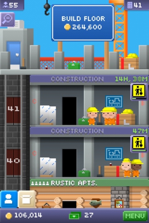While you’re saving up your funds to buy the next floor, and waiting current construction to complete, you spend most of your time ferrying little people up the tower in an elevator. Someone arrives, demands to be taken to floor 27 and you hold the up button until they get there. It’s thrilling. Sometimes they even tip you. And then you’re all “I’m 1/5oth of the way closer to having 1/3 of the money I will need to buy another floor that will be completed some time tomorrow!”