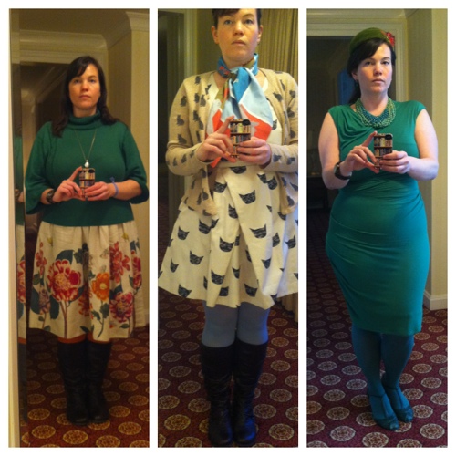 Day 2: Sessions and whatnot – cat dress, cat cardigan, blue tights, brown boots, my Emily + Ross Un-Tourist scarf.
