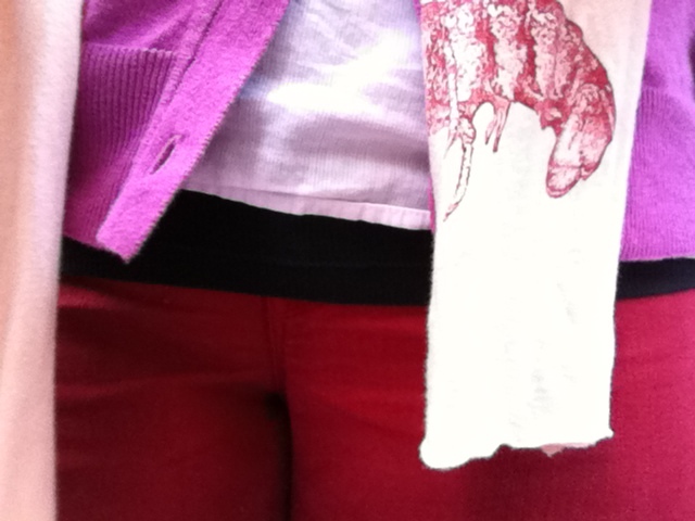 I decided that wearing a pink cardigan and red jeans together at the same time was bonkers, yet awesome.